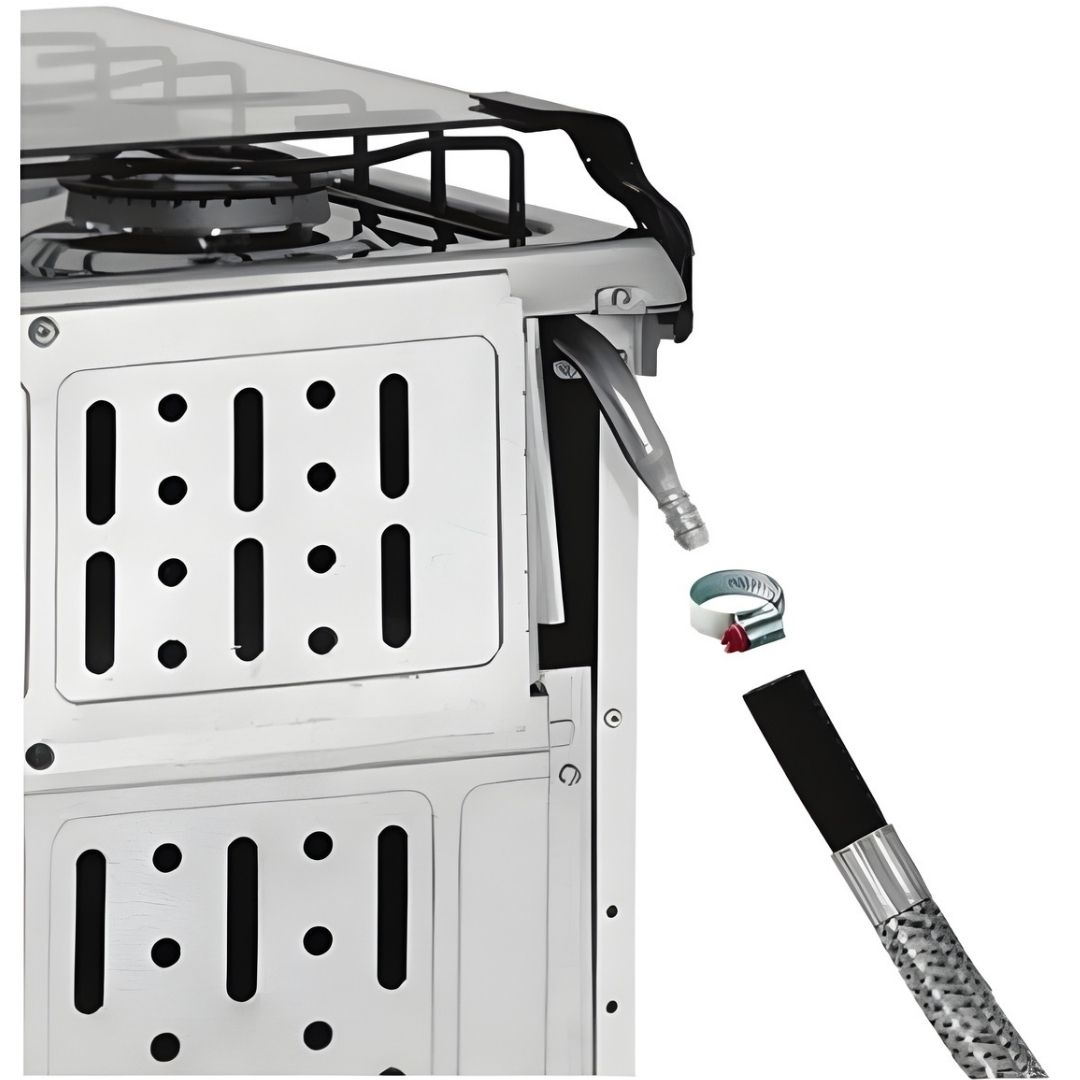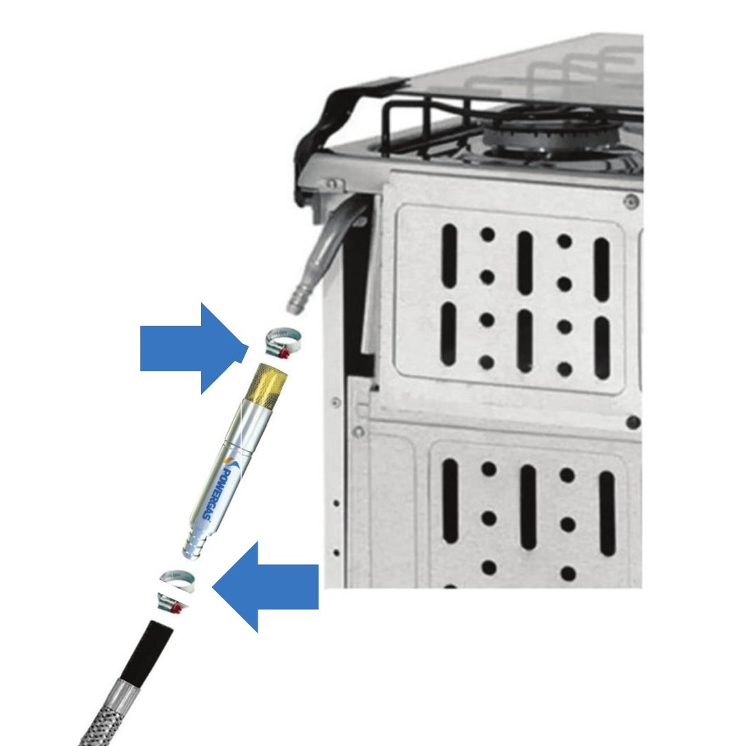 Engate o POWERGAS com a abraçadeira na entrada de gás do fogão. Em seguida engate a mangueira com abraçadeira no POWERGÁS e aperte bem as duas abraçadeiras.